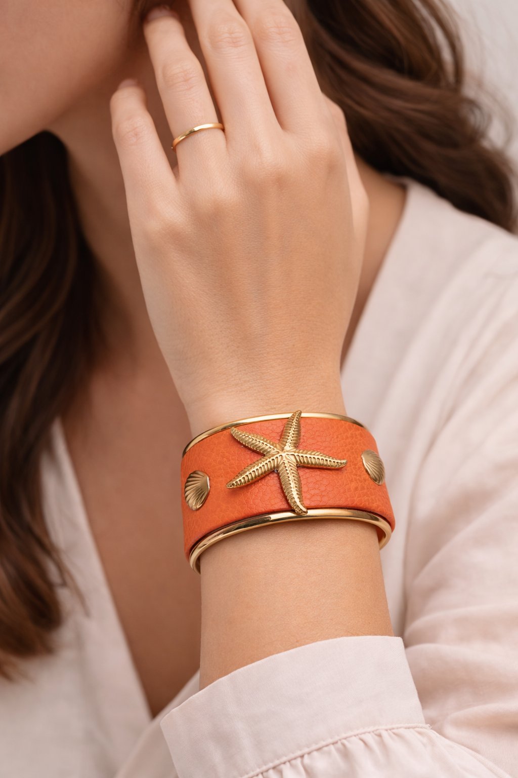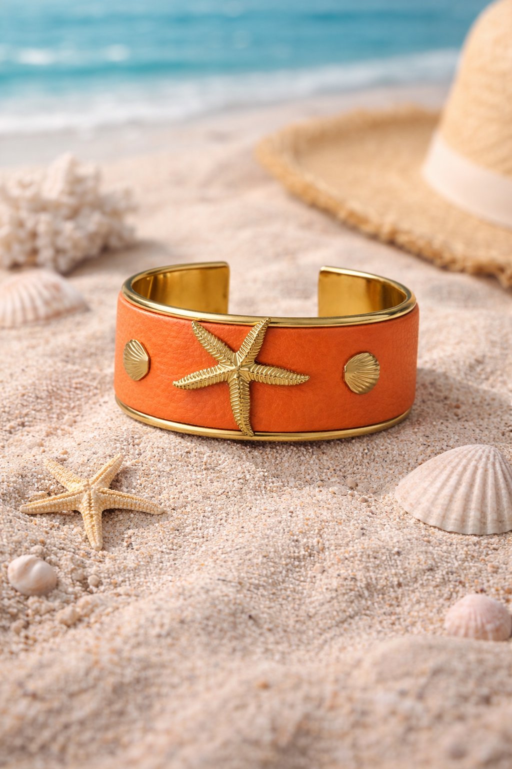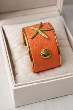dd a warm coastal touch to your look with this handmade coral cuff bracelet. Designed with a textured coral leather band and embellished with a gold-plated starfish and seashell accents, this piece radiates tropical charm and artisanal elegance. The hammered gold-plated stainless steel edges bring a refined, luxurious finish, perfect for any summer or beach-inspired outfit.