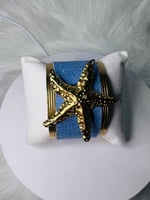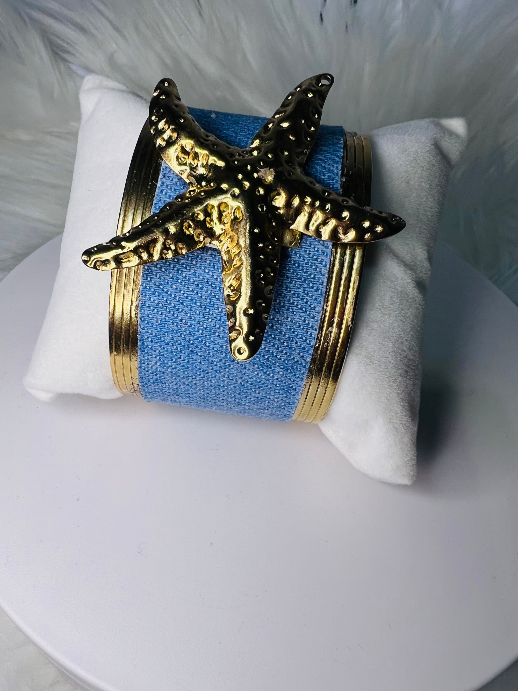 Denim & Gold Starfish Cuff Bracelet – Coastal Chic Ocean Jewelry, Boho Resort Style