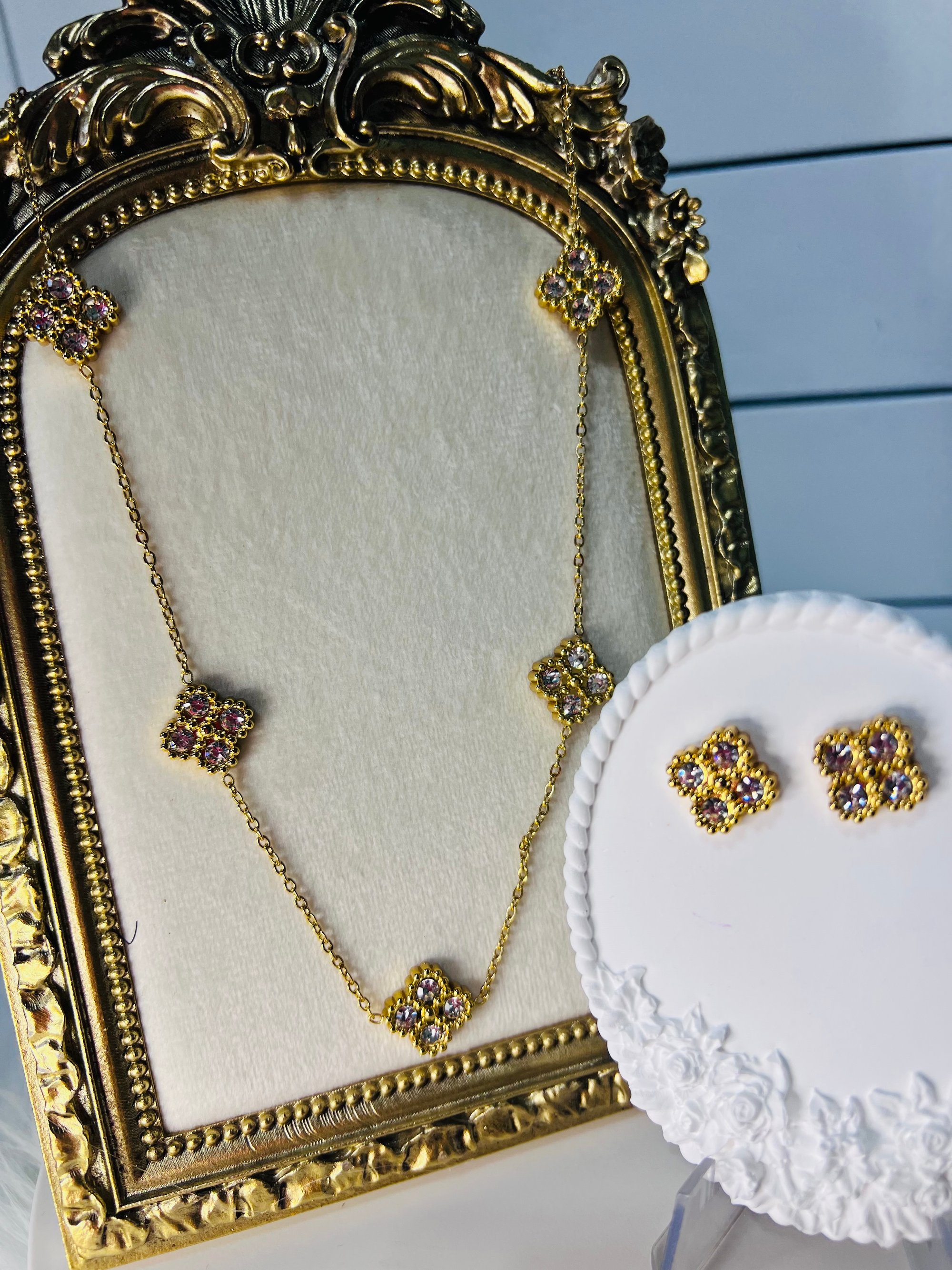 This luxurious clover-inspired jewelry set radiates timeless elegance and sophistication. Crafted from high-quality 18K gold plating, the set includes a delicate necklace and matching stud earrings adorned with brilliant white stones that sparkle beautifully under any light. Each clover design symbolizes luck and grace, making it perfect for both special occasions and everyday refinement.