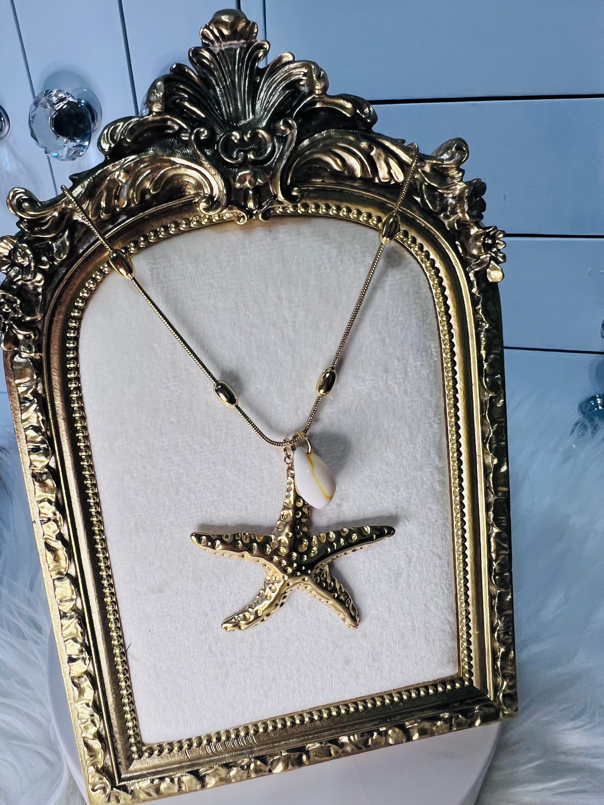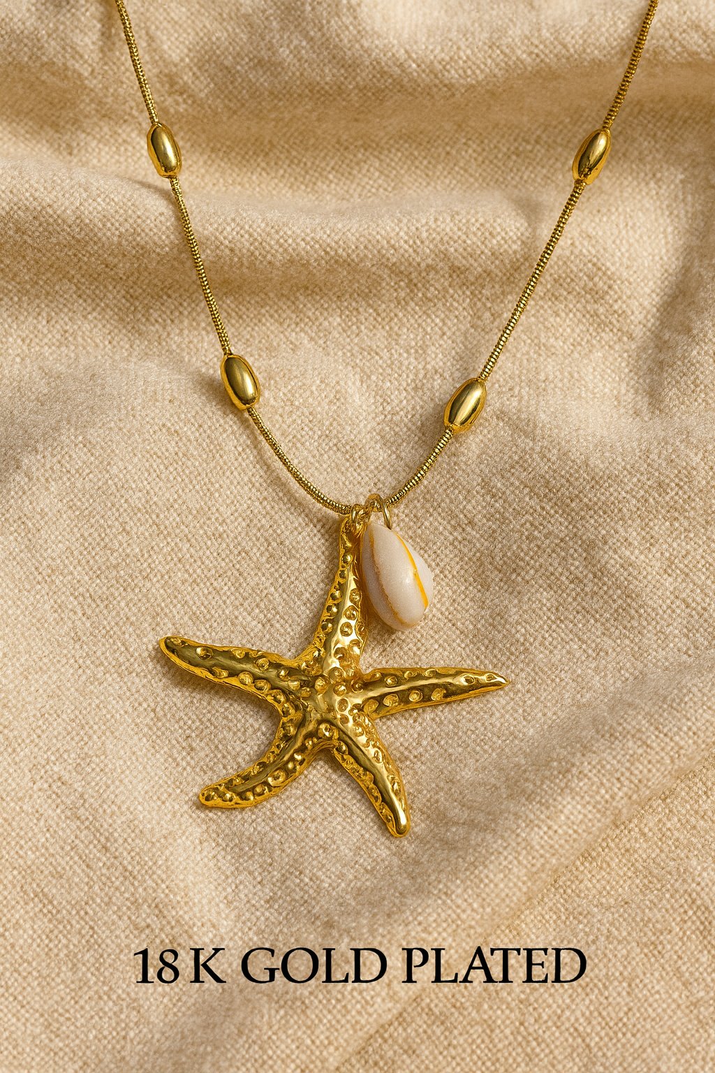 Bring a touch of ocean-inspired elegance to your style with this 18K gold-plated starfish necklace. Featuring a beautifully textured starfish pendant paired with a natural seashell charm, this piece captures the essence of coastal beauty and luxury. The fine gold-plated chain with polished bead accents adds sophistication and shine, making it perfect for both everyday wear and summer getaways.