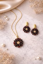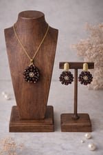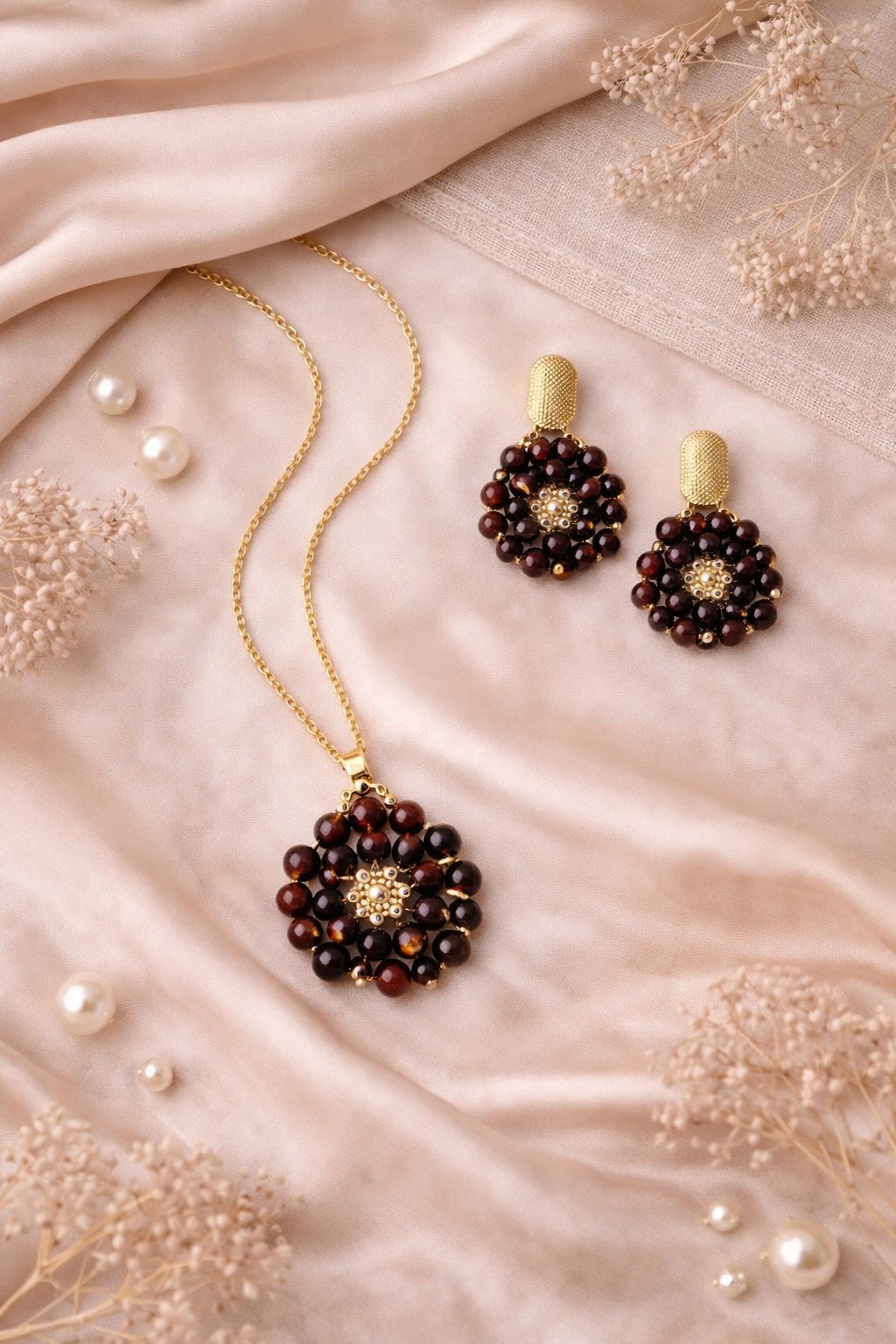 handmade jewelry set, featuring a floral-inspired pendant necklace and matching statement earrings. Each piece is carefully crafted with shimmering faceted crystals and marbled black beads, arranged into a delicate flower design that catches the light beautifully.