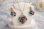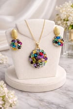 Add a touch of vibrant elegance to your look with this stunning handmade jewelry set. Featuring a beautifully crafted crystal cluster pendant paired with matching earrings, this set sparkles with a harmonious blend of multicolored faceted crystals that catch the light from every angle.