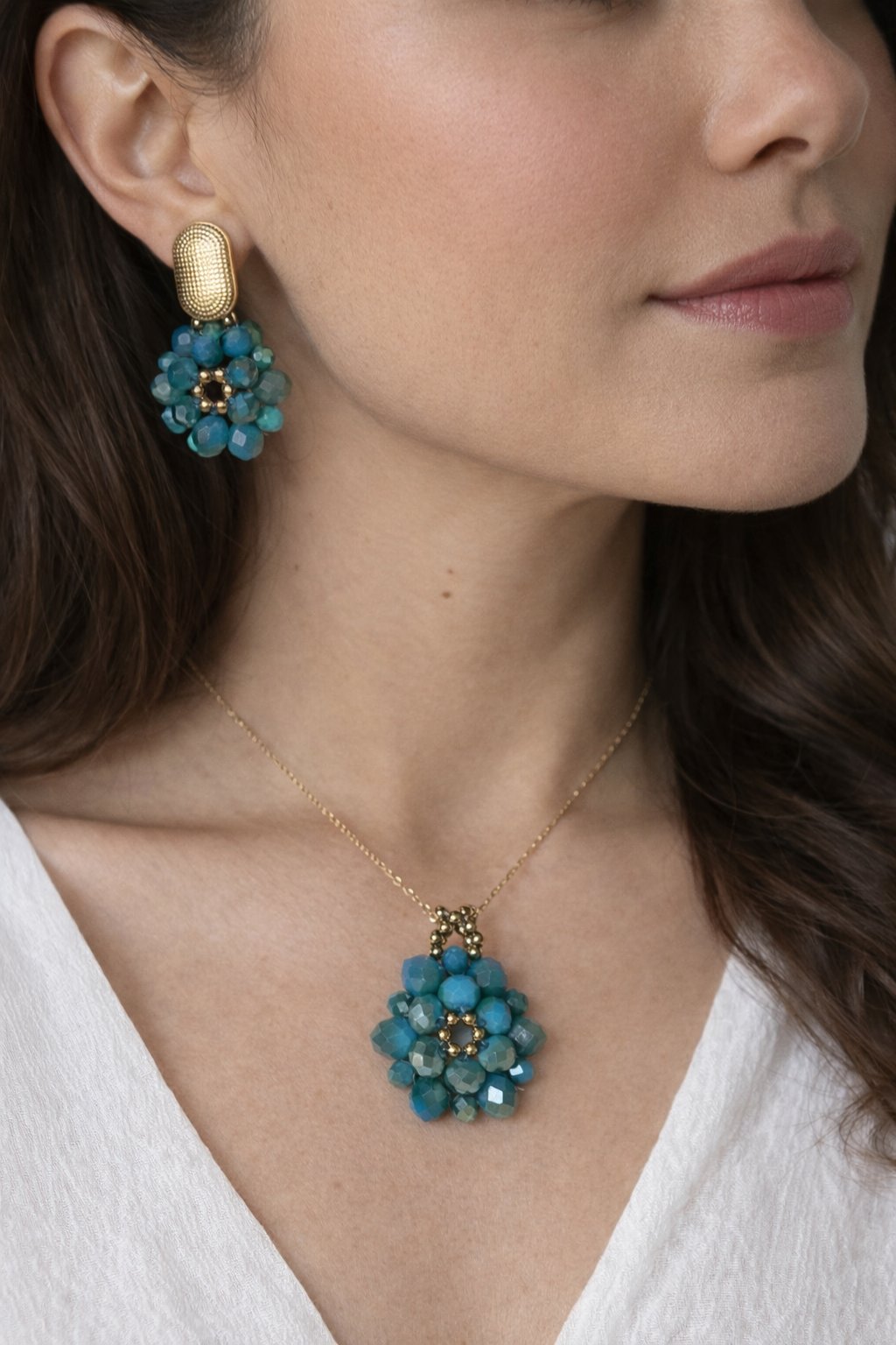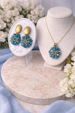 This stunning jewelry set features a vibrant crystal flower design that sparkles beautifully from every angle. The set includes a matching necklace and earrings, both handcrafted with faceted crystal beads and gold-plated stainless steel accents. The necklace showcases a delicate flower pendant on a fine gold chain, while the earrings combine textured gold tops with radiant crystal blooms. Perfect for adding a bold yet elegant touch to any outfit, this set balances luxury and charm for both special occasions and everyday wear.