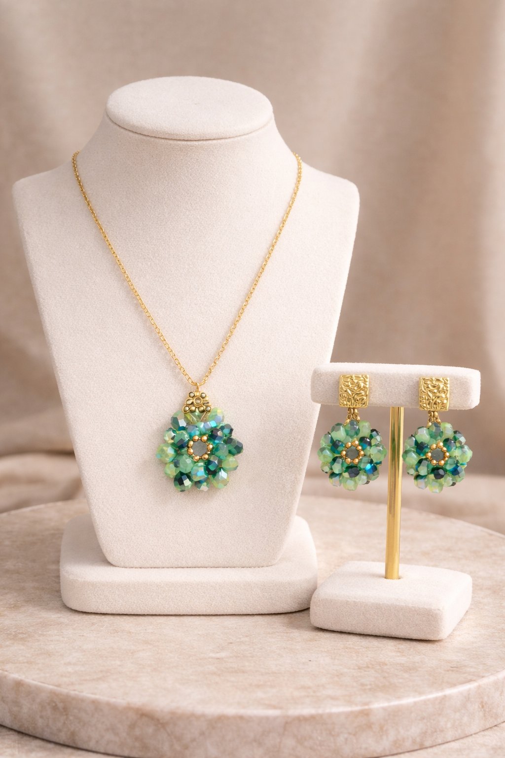 This stunning jewelry set features a vibrant crystal flower design that sparkles beautifully from every angle. The set includes a matching necklace and earrings, both handcrafted with faceted crystal beads and gold-plated stainless steel accents. The necklace showcases a delicate flower pendant on a fine gold chain, while the earrings combine textured gold tops with radiant crystal blooms. Perfect for adding a bold yet elegant touch to any outfit, this set balances luxury and charm for both special occasions and everyday wear.