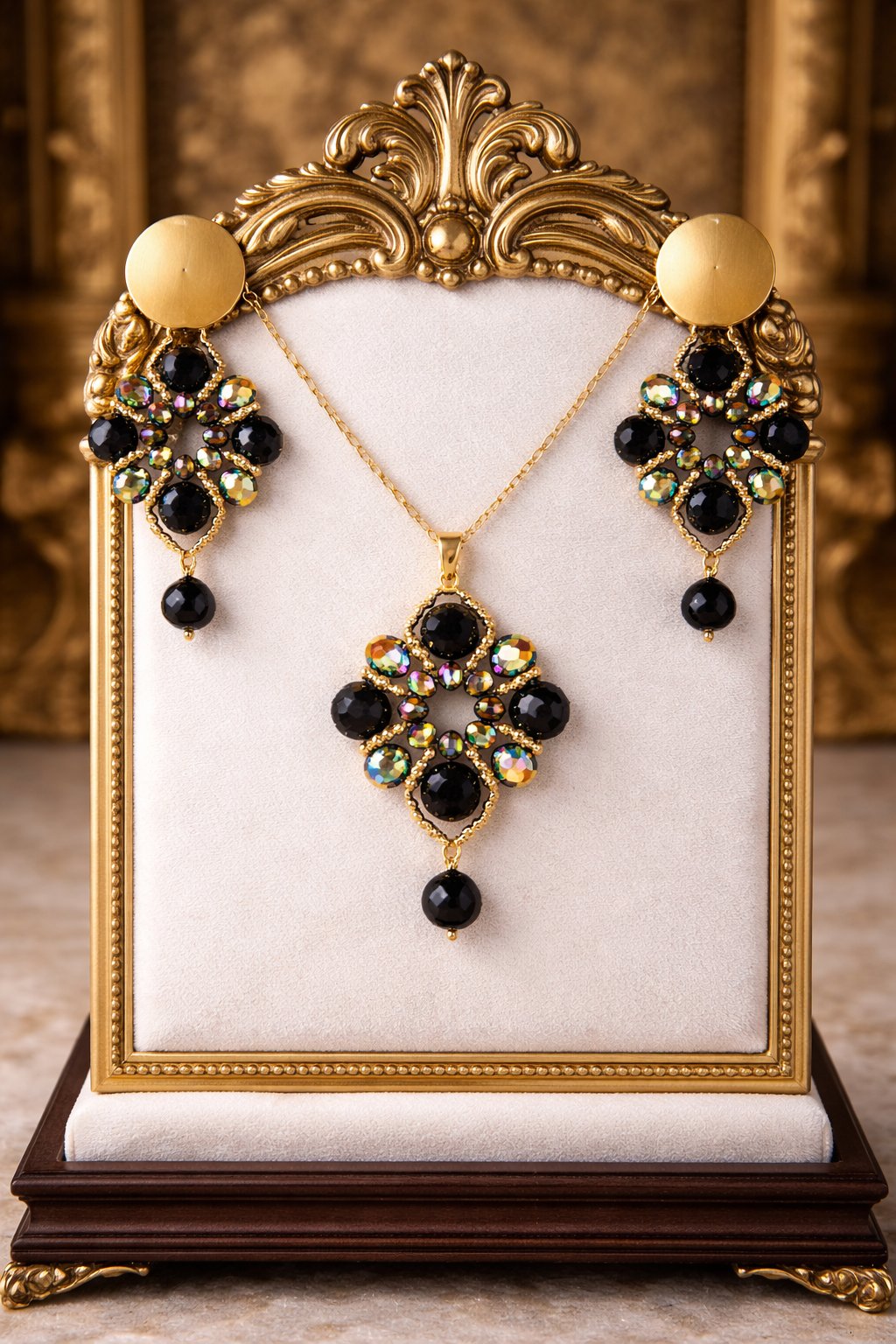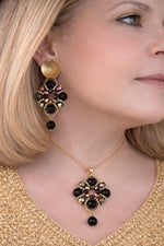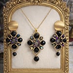 The pendant hangs gracefully from a fine gold-tone chain, finished with a polished black drop bead that adds movement and sophistication. The coordinating statement earrings mirror the ornate structure, making this set striking yet perfectly balanced.