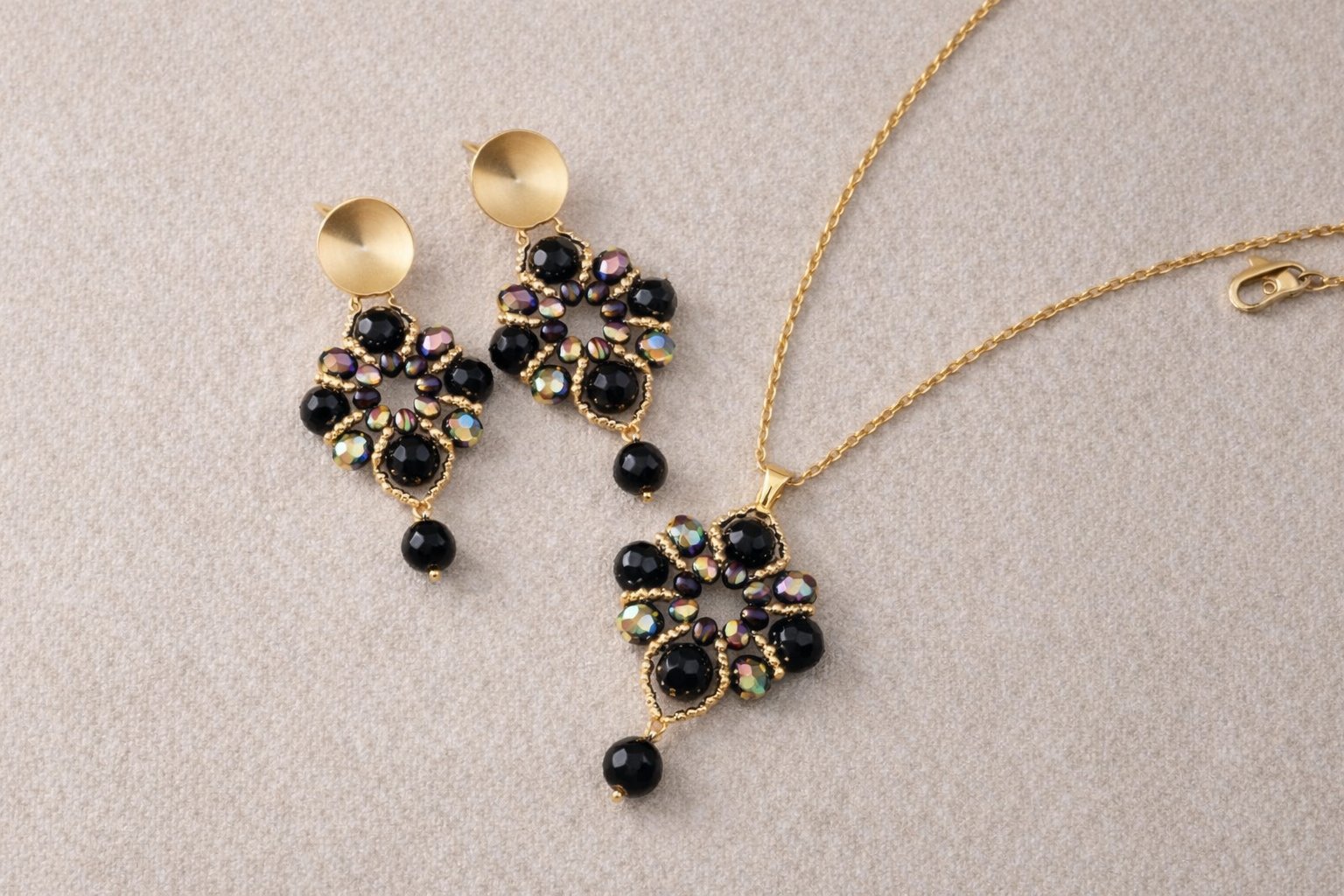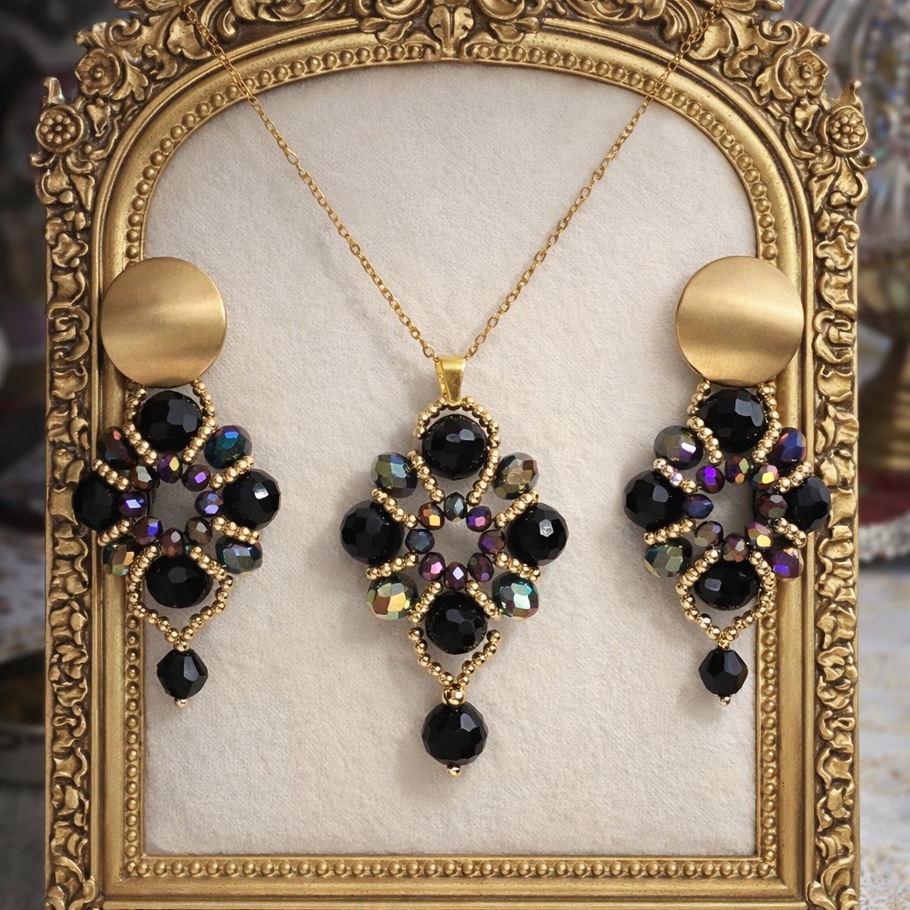 This handcrafted necklace and earring set features deep black faceted crystals surrounded by shimmering iridescent stones that reflect subtle tones of gold, green, and violet under the light. The intricate floral-inspired design is framed with delicate gold-tone beadwork, creating rich dimension and refined contrast.