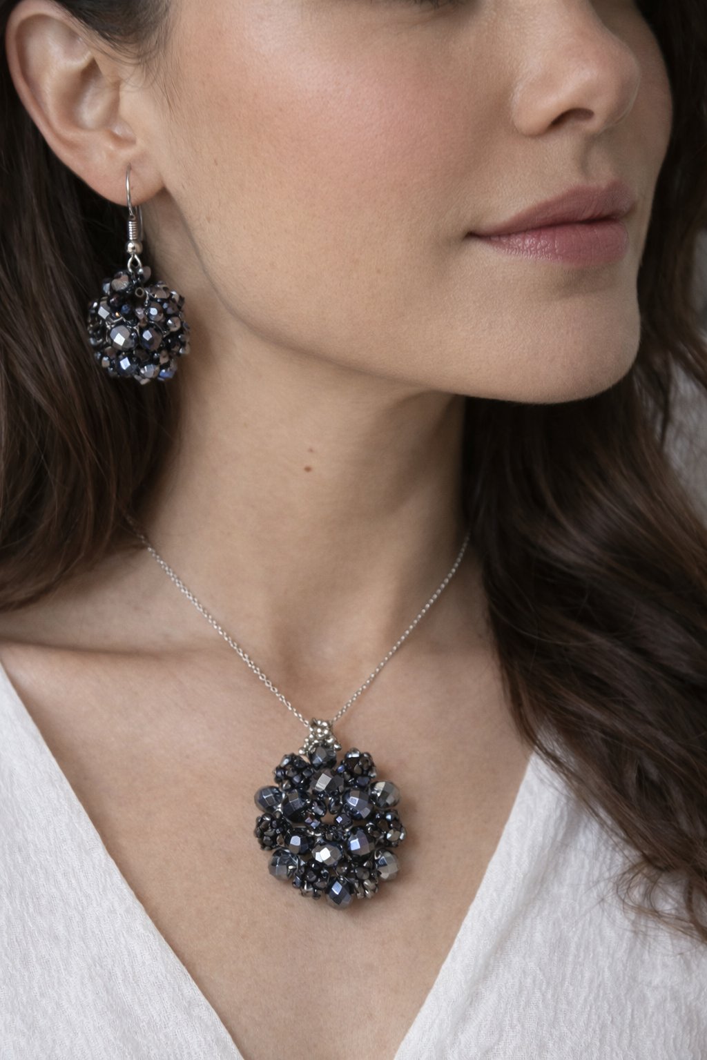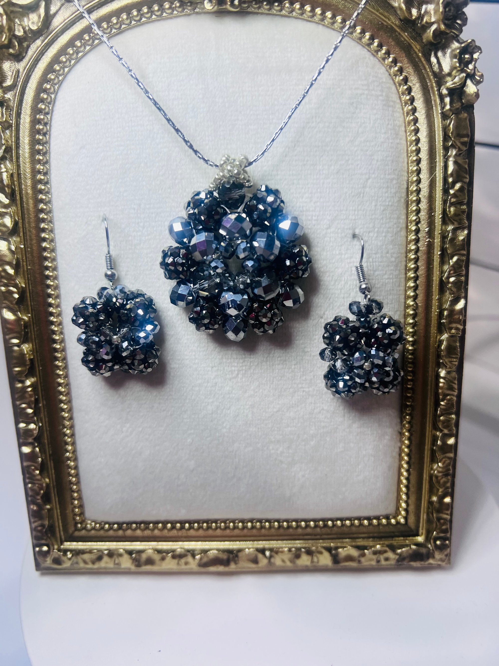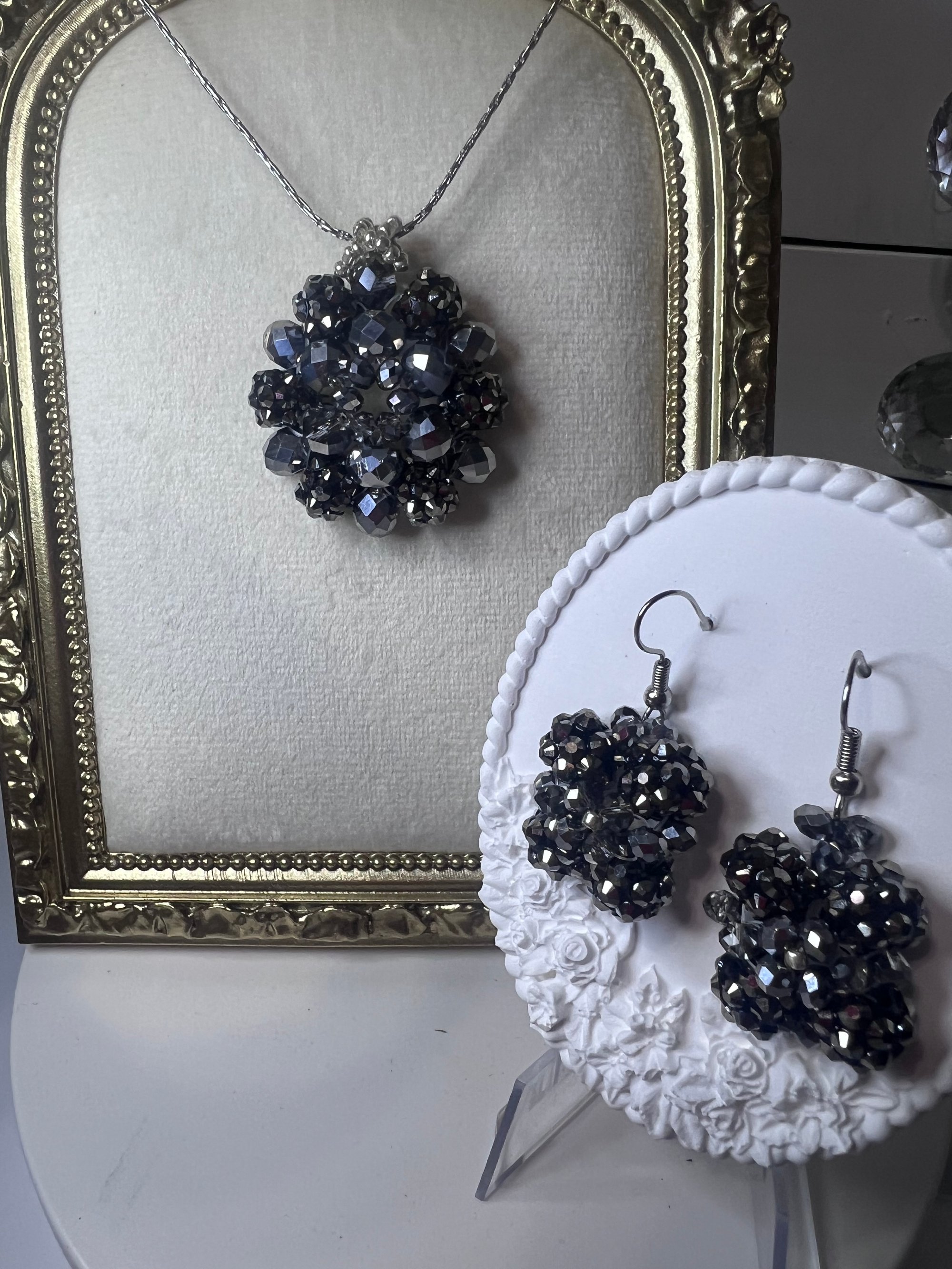 Elegant and timeless, the Midnight Sparkle Jewelry Set features a stunning pendant necklace and matching earrings crafted from faceted hematite-gray crystal beads. Each piece reflects light beautifully, creating a captivating shimmer with every movement. Perfect for evening wear or adding a touch of glamour to any outfit. Handcrafted with care using high-quality materials and stainless steel components for lasting shine and durability.